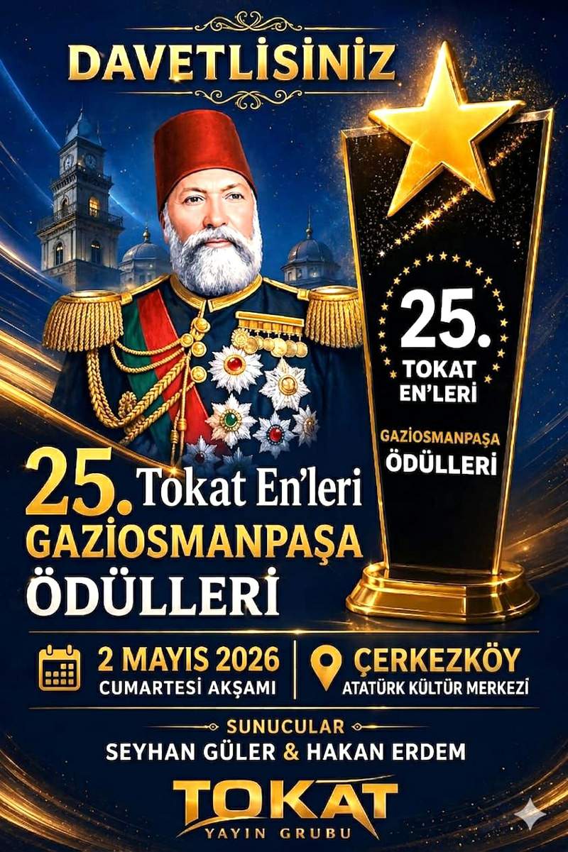25. Tokat Enler Gaziosmanpaşa Ödülleri, 02 Mayıs 2026 Cumartesi akşamı, saat 18.00 22.00 arasında 700 kişi kapasiteli Çerkezköy Atatürk Kültür Merkezi’nde sahiplerini bulacak